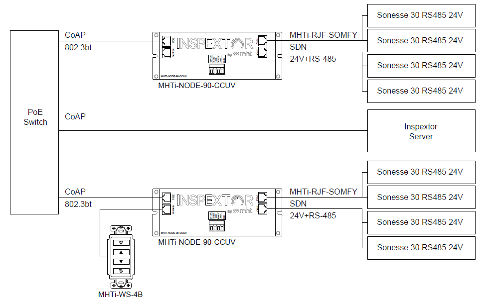 MHT Inspextor Node-90-CCUV and Node-Mini offer a seamless and intelligent solution for powering and controlling Somfy Sonesse 30 RS485 24V shade motors. This system simplifies the integration of smart shades into any space, providing both manual and automated control options.
